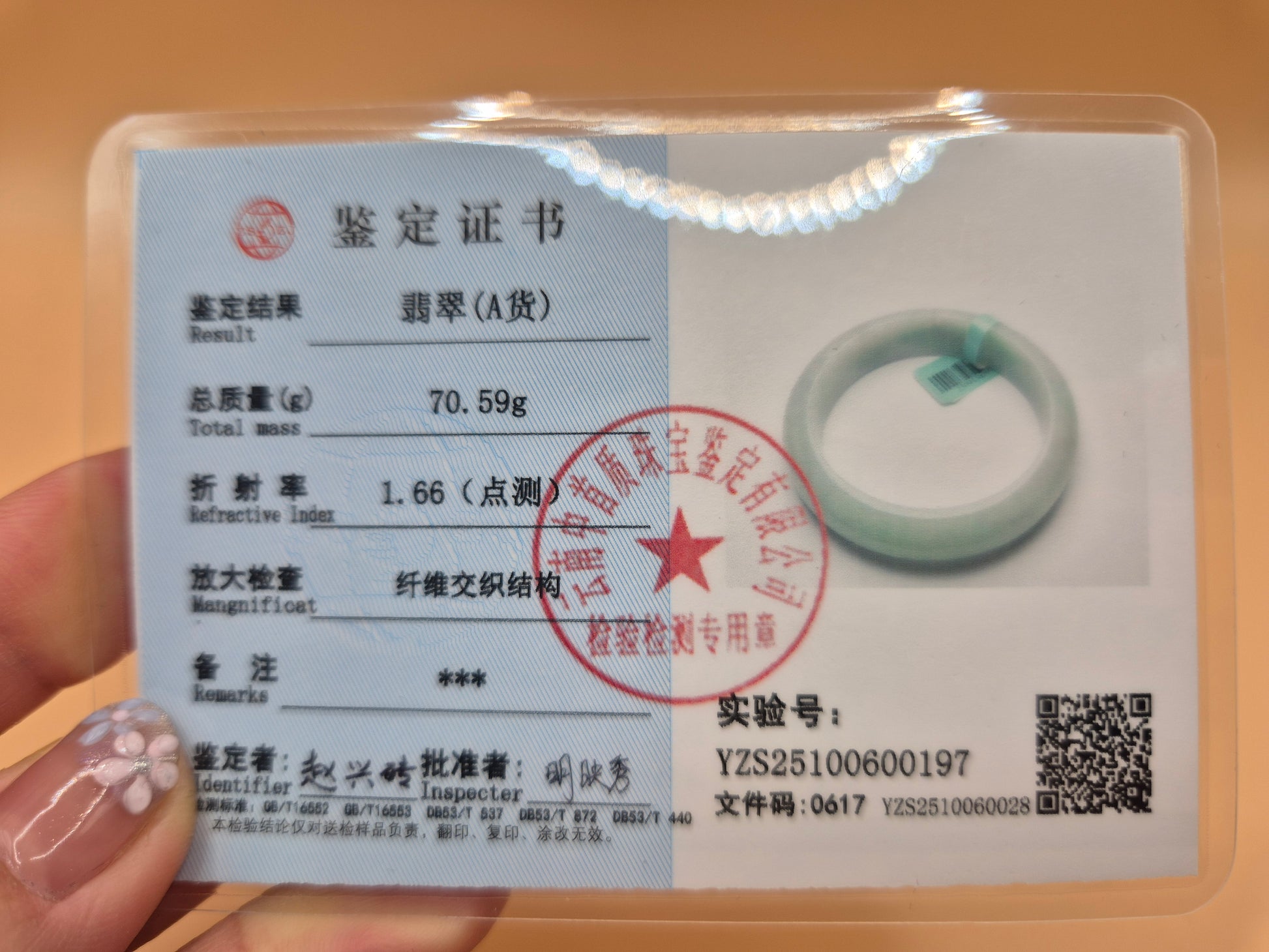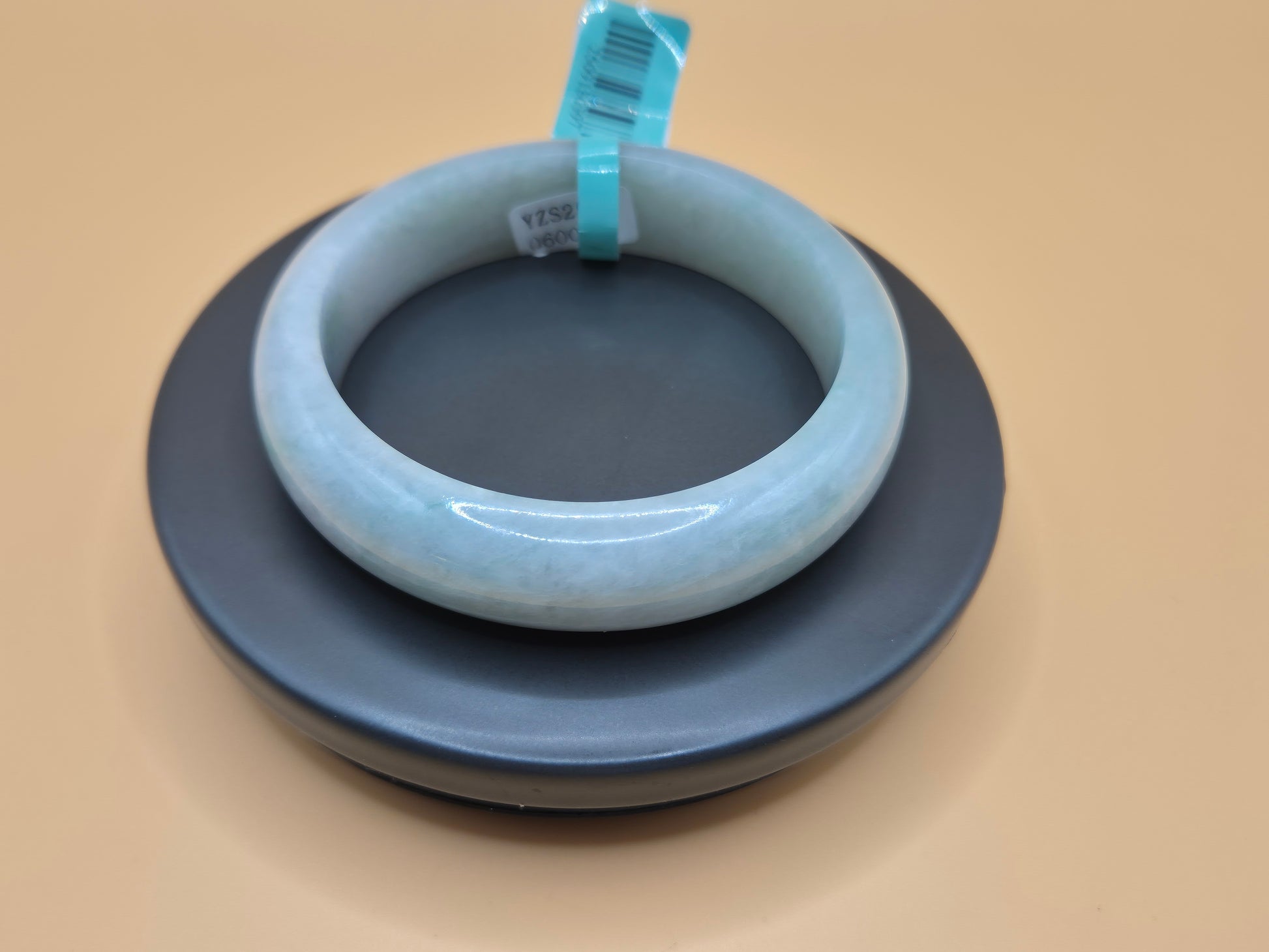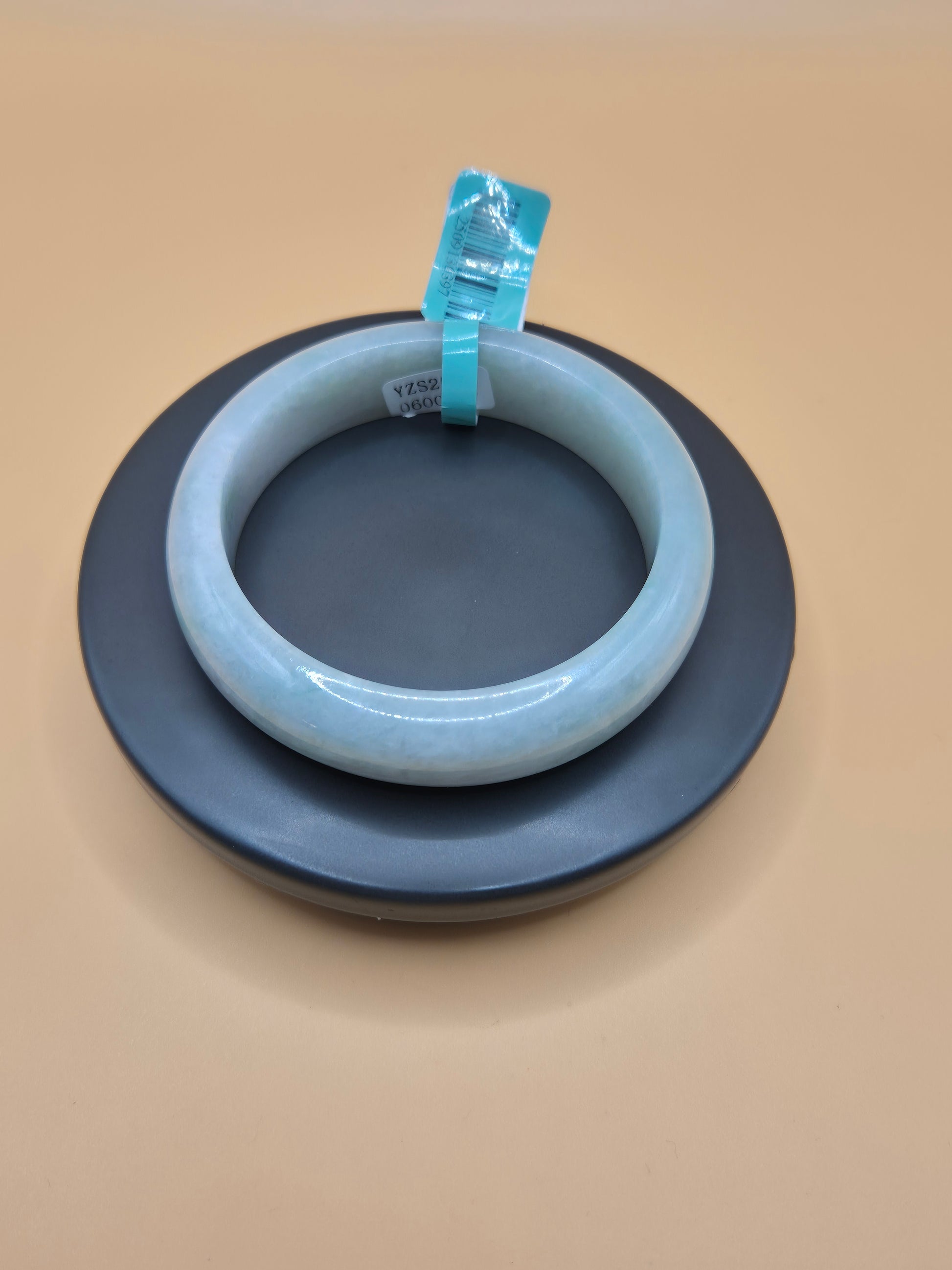 This is a beautifully polished jade bangle with a serene, translucent pale blue hue. Its soft luster and subtle cloudy marbling reflect the classic elegance often found in high-quality jadeite. The rounded outer and inner surfaces suggest a comfortable fit, while the refined, minimalist design enhances its timeless appeal. Measuring 56.7mm in inner diameter, it's suitable for a medium wrist. The bangle has a gentle sophistication that would complement both everyday wear and special occasions.