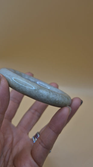 This refined jadeite bangle features a gentle fusion of lavender-grey and soft green tones, creating a serene and sophisticated look. Its smooth, glossy finish highlights the natural gradients and subtle patterns within the stone. At 50mm, it's an ideal fit for smaller wrists, offering understated elegance with a premium feel.