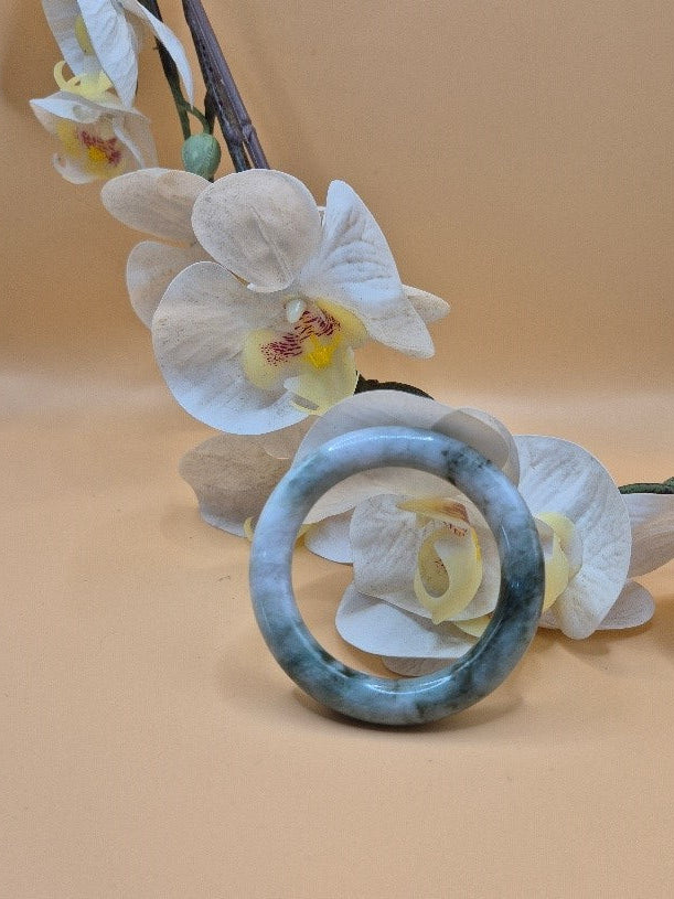 This jadeite bangle features a natural blend of soft greyish-white and mossy green tones, creating a serene and earthy appearance. At 50mm, it offers a snug and comfortable fit, with a smooth polish that enhances its organic charm. A beautiful piece for those who appreciate subtle elegance and the raw beauty of nature. Comes with Certificate of Appraisal.
